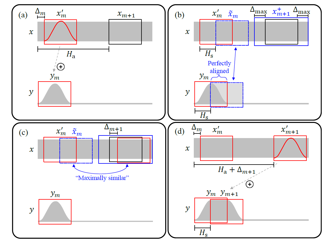 WSOLA 算法的计算步骤如图 4 所示,其实相比于 OLA,WSOLA 会在 xm+1 帧的附近寻找和输入信号中如果也移动步长 Hs 的信号 x~m 相似度最高的一段 x’m+1 来做拼接。