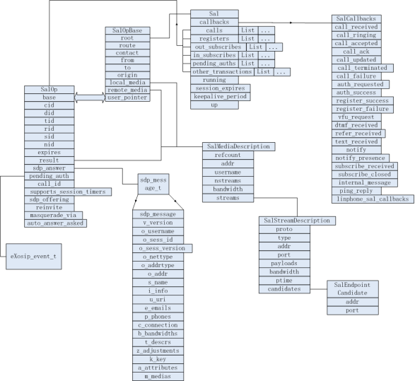 一个基本的描述就是:sal作为signal abstract layer包含了上层所主要理解的交互信息,这些信息对于理解电话操作而言已经足够了,在底层,选择了osip和exosip来支持这项操作。所以实际上来说,可以用其他支持sip的库的接口来替代现有的,保留sal层接口的功能定义。在linphone中,虽然大部分使用了sal层的封装来完成sip交互过程,但是也调用osip和exosip库本身的其他接口,所以这层封装主要还是再次简化协议层的处理,使得功能更具体,而不是更单一。