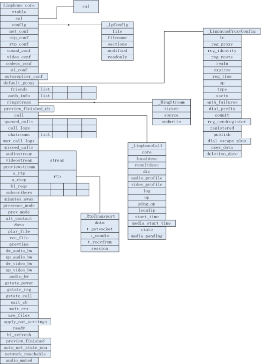 程序中定义了一个比较大的数据结构体——linphonecore,将其作为总的控制结构。通过该结构体,可以找到所需的大部分信息。这些信息要么是直接在该结构体中定义,要么是在其包含的模块相关的子结构体中。可以想象,内存中保存的该结构体,就像整体软件信息的总控点,通过该总控点,可以直接或者间接的得到系统相关的信息,这在一定程度上可以简化系统的架构和实现。(在许多开源软件中都可以看到这种代码架构方式。)下图展示了linphonecore结构体: