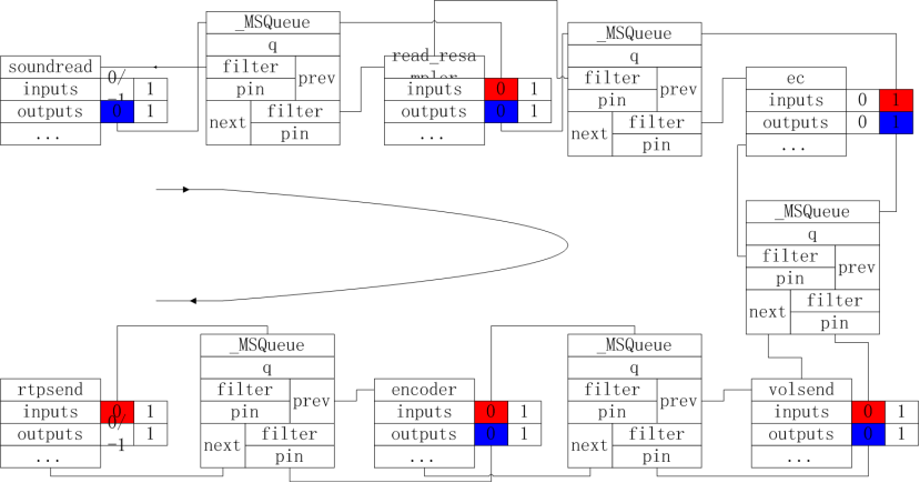 Ms_init中形成了三个全局链表,一个为filter描述符链表,所有media streamer支持的filter的描述符在这里被串接在一起了,包括编解码,音视频读写以及RTP发送和接收处理相关的filter。第二个为音频卡描述符链表,所有支持的音频卡相关的描述符也被串接在一起。第三个就是视频卡描述符链表,处理类似音频卡描述符。