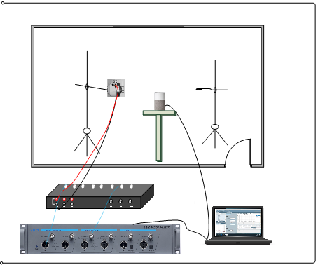 4)待测设备放置到房间中间的支架上,建议扬声器离待测麦克风的距离为1m,扬声器中心距地面1.2m。待测设备麦克风阵列的中心位置与扬声器发音中心位置在一条水平线上,即声波的入射方向与参考轴方向夹角为90°。设备测试示意图如图1。