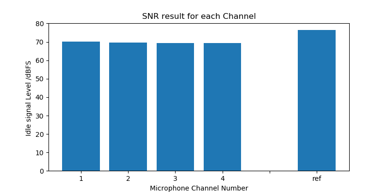 使用高保真音箱播放“ANST测试音频.wav”,距离待测设备1米距离,待测设备MIC处声压级94dBA。MIC阵列平面与高保真音箱喇叭平面平行,使每个mic到喇叭的距离相等。使用待测设备的MIC阵列接收信号,待测设备采集到的音频使用《ANST远场语音交互硬件测试软件V2.0》中的SNR_calc模块计算,得到MIC通道和REF通道的信噪比性能图。