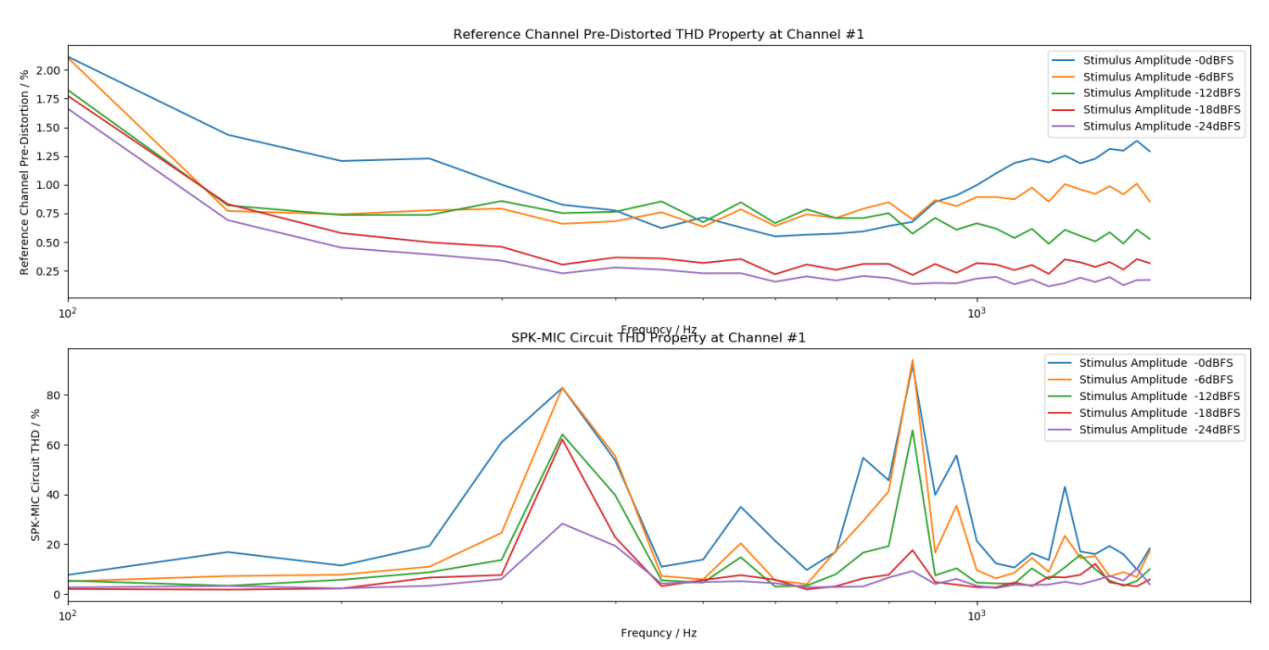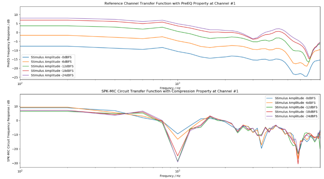 回采预处理特性为参考指标,仅用于帮助定位问题点。整机谐波失真测试如图5示例,上图为回采通道传递函数曲线,下图为MIC通道传递函数曲线。上图表示回采通道存在自动增益控制(AGC),会影响回声消除,需关闭该功能。