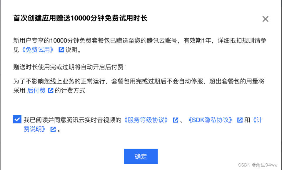 进入腾讯云官网,需要微信扫码进入,提示开通腾讯音视频服务,点击【同意】,就可以获取10000分钟的试用时间