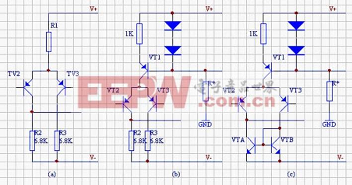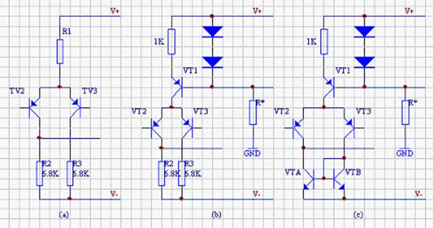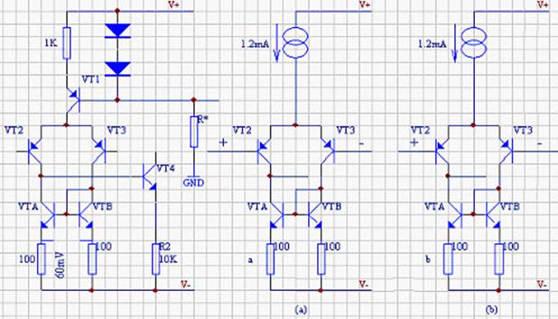 图1-4示出了标准输入级(a)和加有恒定互导(gm)负反馈输入级(b)的电路原理图。经计算,各管加入的负反馈电阻值为22Ω当输入电压级为-40dB条件下,经测试失真由0.32%减小到了0.032%。同时,在保持gm为恒定的情况下,电流增大两倍,并可提高转换速率(10~20)V/us。