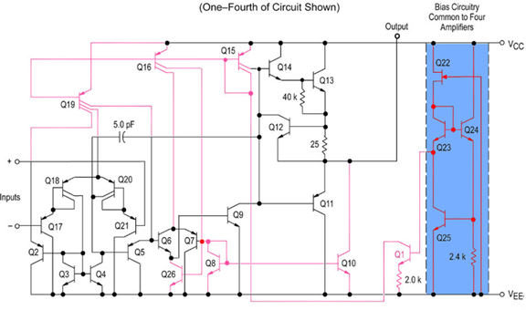 在输入级电路中,输入对管的直流平衡是极其重要的。为了取得精确的平衡,在输入级中加上一个电流反射镜结构,如图1-3所示。它能够迫使对管两集电极电流近于相等,从而可以对二次谐波准确地加以抵消。此外,流经输入电阻与反馈电阻的两基极电流因不相等所造成的直流失调也变得更小了,三次谐波失真也降为不加电流反射镜时的四分之一。