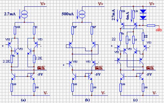 放大器的输入级功率放大器的输入级几乎一律都采用差分对管放大电路。由于它处理的信号很弱,由电压差分输入给出的是与输入端口处电压基本上无关的电流输出,加之他的直流失调量很小,固定电流不再必须通过反馈网络,所以其线性问题容易处理。事实上,它的线性远比单管输入级为好。图1-2示出了3种最常用的差分对管输入级电路图。