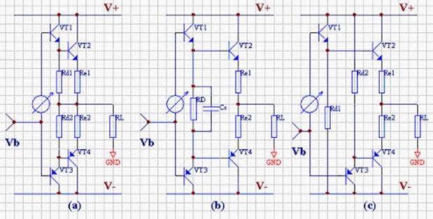 三种类型电路中,(a)为盛行的一种,其特征是把驱动管的射极电阻连接到输出电路上去。而(b)类型两驱动官所公有的射极电阻Rd不在接到输出电路上,可以在输出管正处于关断时让驱动管对其发射结加以反偏置。(c)类型是通过把两驱动管射极电阻分别接到侧供电电路上(而不是接到输出电路上)来维持驱动管工作于甲类状态的一种结构。其突出的特点是在对输出管基极进行反偏置这一点上,表现的与(b)类型同等良好,高频事会关端得更为干脆。