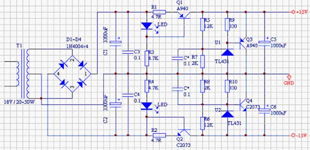 图1-13是用与集成运放的电源实例,该电路可输出约0.3A的电流,是一个性能很好的并联稳压电源,各晶体三极管要加足够大的散热器。