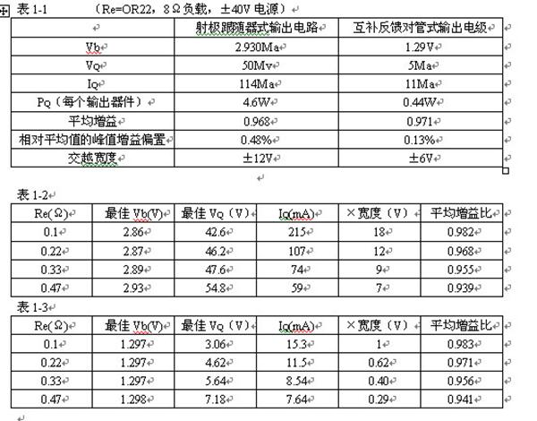 实验证明,就大多数指标而言,互补反馈对管式输出级优于射极跟随器式输出级。有关实验结果于表1-1、1-2、1-3中,其中表1-2、1-3分别为互补反馈对管式输出级及射极跟随器输出级和互补反馈对管输出级的实验结果。表中Vb为倍增偏置发生器在驱动级基极两端建立的电压,工作于乙类放大状态时,Vb=Vq~3Vq,Vq为在两个发射极电阻Re两端产生的静态电压,通常Vq=5~50mV,依所选的电路结构而定。静态电流Iq为流过输出器件的电流,其中不包括驱动级稳定电流。