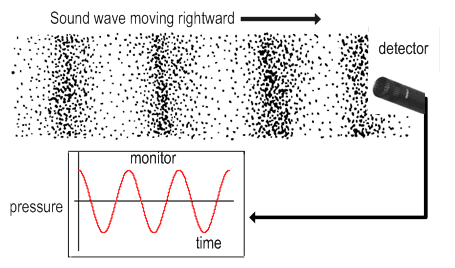 人听到的声音本质上就是气压的变化,或者大堆空气分子的振动。声音在空气中传播时,如果你眼睛能看见空气的分子,那么空气大概是下面这张图这样的: