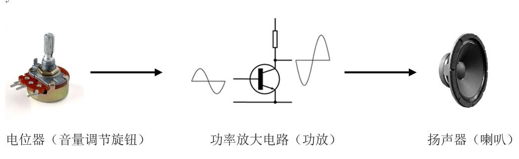 举个例子,画个简图,电位器调节功率放大电路的输入,相应的,被功率放大电路驱动的扬声器发出的声音也相应变化了。