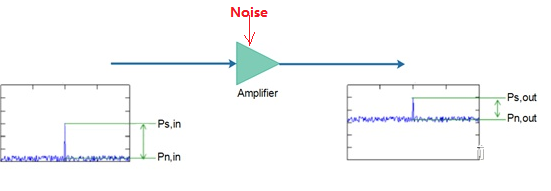 假设我们把功率Ps的信号输入放大器。当然,除了信号外,放大器的输入端也会有一些噪声,假设是Pn,in。因此,放大器的输出将包括带功率输出Ps,out的信号和带功率输出Pn,out的噪声。(也就是说放大器会把噪声一并放大)