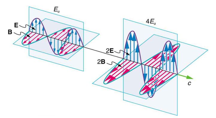 电磁波强度I与电场和磁场的强度成正比,电磁场的强度与电流的平方成正比,在阻抗不变的情况下,电磁场的强度与电磁波的幅度的与电磁波的幅度的平方成正比。