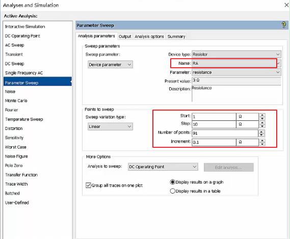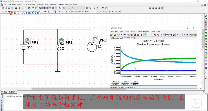 参数扫描可以对任意元器件在设置范围内进行扫描,扫描类型有线性扫描、(二)倍频扫描、十倍频扫描和列表扫描(单点扫描);直流扫描只针对直流源,可对1-2个直流源的设置范围进行线性扫描,典型应用是MOS管的输出特性曲线绘制,对Rds进行参数扫描,对Ugs进行直流扫描。下图是从功率守恒的角度进行的参数扫描。