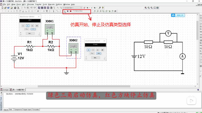 交互仿真是使用面板上的虚拟仪器进行电路仿真和测量,最大的好处是通过虚拟仪器的使用熟悉现实中万用表、示波器等常用仪表的使用。交互仿真类型为interactive,点击绿色三角启动仿真,红色方块停止仿真。