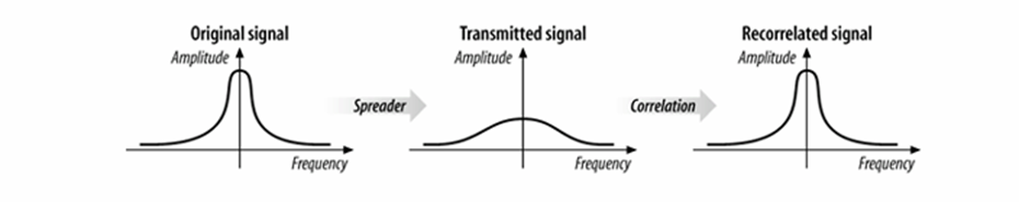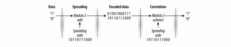 把将要传输的数据流通过扩频码调制而认为地扩展带宽,即使在传输波段中存在部分噪声信号,接收机也可以无错误的接收数据。
