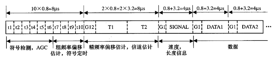 8~16 uS: 一个长时训练符号, 由两个3.2 uS 的OFDM 长度, 两 个0.8 uS的保护间隔组成