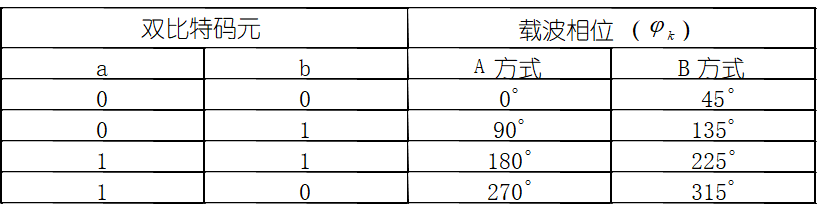 四进制码元又称为双比特码元。它的前一信息用a代表,后一信息比特称用b代表,双比特码元中两个信息比特ab提出按照格雷码(即反射码)排列的。它与载波相位的关系如下表示。矢量图如下。