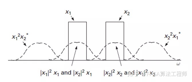 图3 两个载波信号x1和x2的线性和三阶IMD谱
