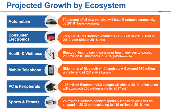 1995年,当Bluetooth Special Interest Group (SIG) 成立时,它只有5家发起公司,而现在,它已经是拥有超过18000家的大型技术组织了。而且其会员仍以每月200家的速度递增。这些会员单位在2012年出货了20亿个蓝牙产品,在2013年,他们会将蓝牙的总出货量提高到惊人的25亿!