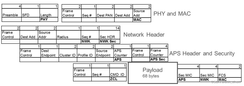 Zigbee 使用 IEEE 802.15.4 2006 和 127 字节数据包,底层数据速率为 250 kbps。 Zigbee 数据包格式如下所示,并产生 68 字节的有效负载。对于 68 字节以上的
