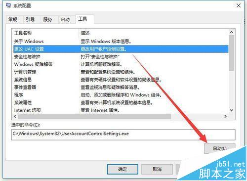3、待打开“系统配置”窗口后,切换到“工具”选项卡,选中“更改UAC设置”项,点击“启动”按钮以打开UAC设置界面。