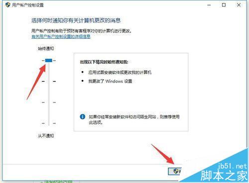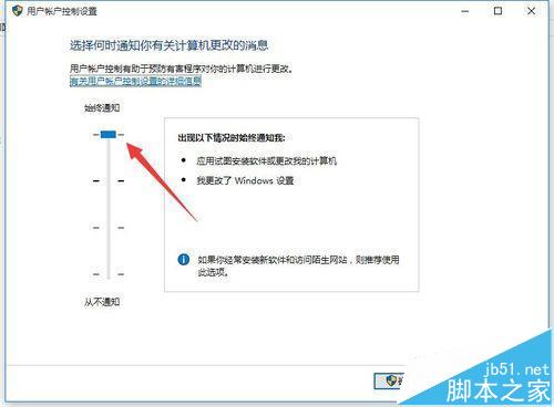 4、从打开的“用户账户控制设置”界面中,将滑块移动到最上方(始终通知)处,点击“确定”按钮即可。