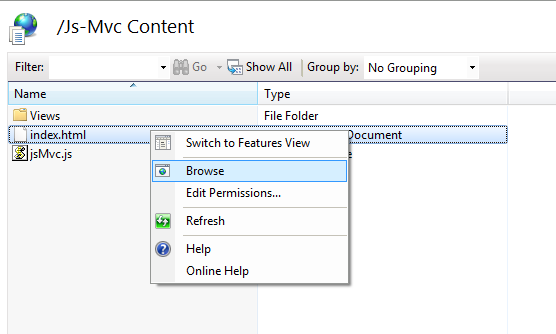 跑在服务器里是必要的,因为代码加载从存储于外部文件中的视图,浏览器不会允许我们的代码在非宿主服务器环境下执行。当然如果你使用Visual Studio那么直接在目标html文件上右键,选择‘View In Browser'即可。