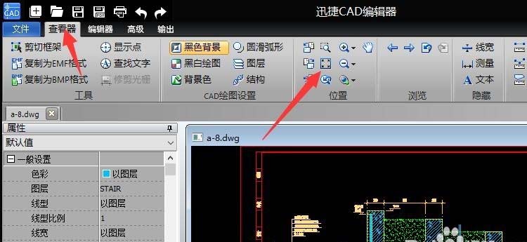 4、在使用任意一款CAD编辑器打开想要进行编辑的CAD图纸文件,即可在“查看器”选项卡,利用相关缩放工具进行查看。