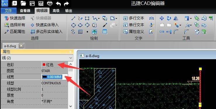 6、待相应图形对象被选中时,我们就可以在左侧“属性”窗口中对其“颜色”和“线宽”进行设置操作了。