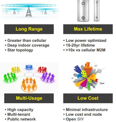 通讯距离远(适合半径500m~2km,通信距离大于7000千米,解决了低功耗和远距离不能兼得的难题),低功耗优化的长电池寿命(Aloha方法有数据时才连接,电池工作几年)、低成本(非授权频谱,远距离通讯中成本最低的,无网络的户外)、集中式低频次、数量小(非视频)、长距离数据传输(和传感器集成),组网方便,稳定性也更高(相比2.4G和蓝牙、WiFi等技术).抗干扰性(协议里面有LBT的功能,基于aloha的方式,有自动的频点跳转和速率自适应功能)