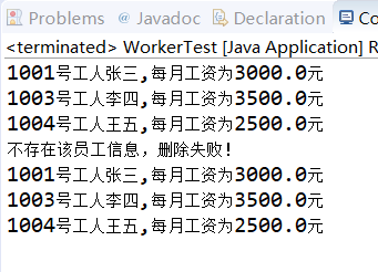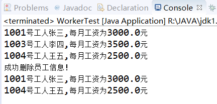 if (a1.remove(new worker("1003","李四",3500)))System.out.println("成功删除员工信息!");