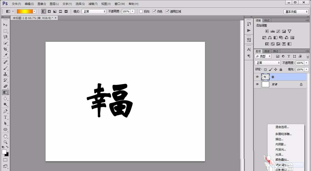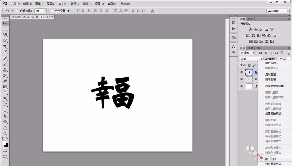 3、将“幸”字图层复制文字出一个副本,将“幸”字改成“福”字,并将其“栅格化”处理,如图所示。