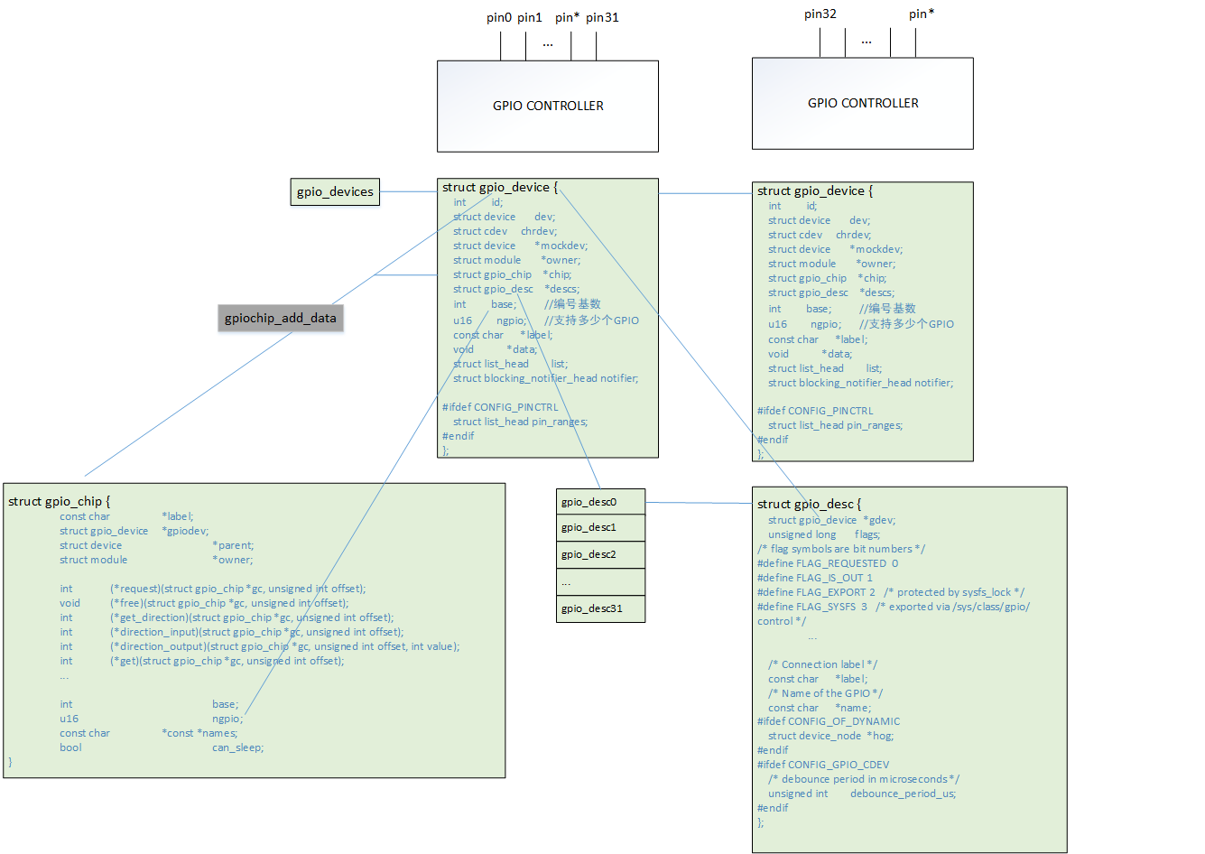 一个GPIO控制器,对应一个gpio_chip结构体在驱动中实现其内部函数的配置,最终通过gpiochip_add_data注册进内核,内核同时生成gpio_device结构体。所有gpio_device被放置在gpio_devices全局链表中。