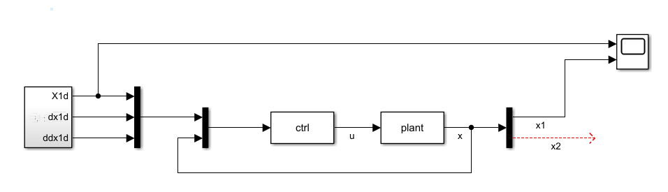 搭建结果大致如上。其中第一个模块是上一篇文章中搭建好的((6条消息) Simulink学习记录:一种非线性系统自适应控制器的搭建_HFUTdumpling的博客-CSDN博客)。
