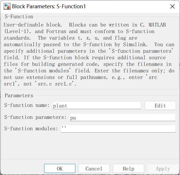 这里将名称“system”改为之前编辑好的s函数文件名称即可直接与之前编辑的文件对应起来了。然后自己申明的参数是需要写出来的(如pa)。
