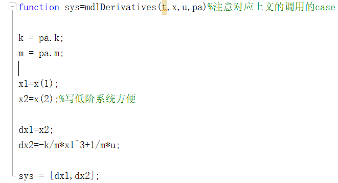 t:时间;x:系统的状态(列向量);u:系统的一个输入(列向量);flag:标志