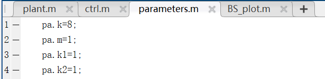 首先新建四个脚本,分别是plant(系统),ctrl(控制器),parameters(参数),BS_plot(绘图)。