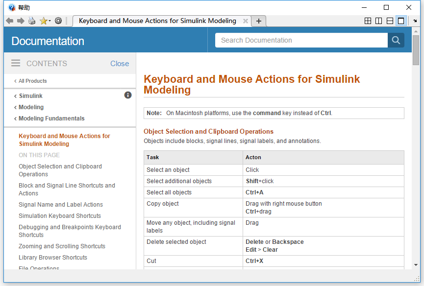 点击菜单 Help -> Keyboard Shortcuts,可以打开“Simulink 建模的键盘和鼠标操作”帮助。
