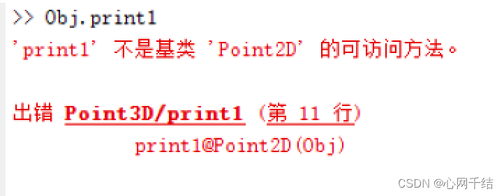 如果将Poni3D类中方法名称'Print'改成'Print1',则会显示'print1' 不是基类 'Point2D' 的可访问方法。因此,需注意的是,子类调用父类的方法时,名称必须与父类匹配。