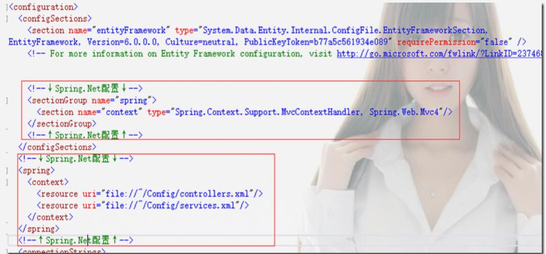 在配置文件的configSections节点中增加如图的sectionGrup节点,configuration节点中增加Spring节点,并在spring节点中的context节点中使用resource节点设置配置文件的路径。