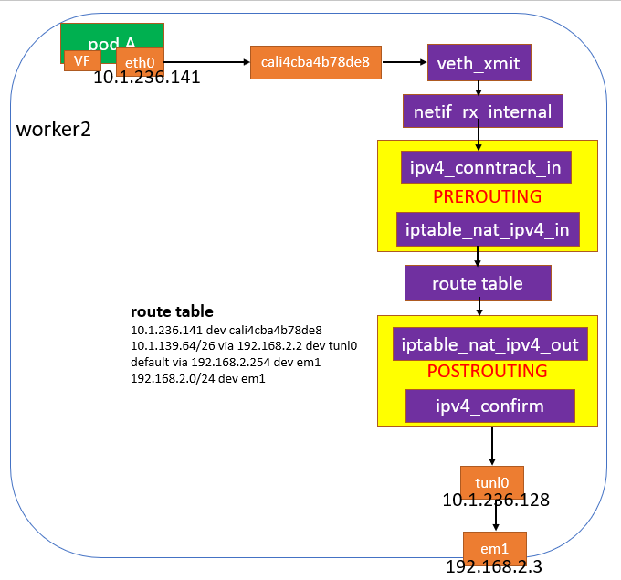e. 重点分析worker2上,报文从cali4cba4b78de8发出去到tunl0封装之间都有哪些流程。如下图,中间需要经过conntrack和nat模块处理。