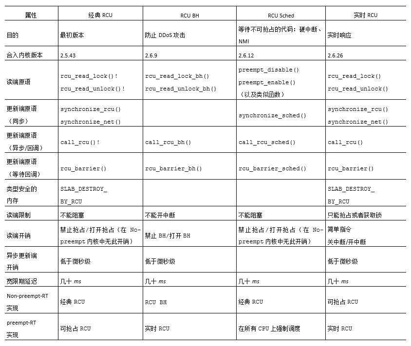 RCU的优点在于:性能、不会死锁,以及良好的实时延迟。当然RCU也有一点缺点,比如:读者与更新者并发执行,低优先级RCU读者也可以阻塞正等待优雅周期(Grace Period)结束的高优先级线程,优雅周期的延迟可能达到好几毫秒。
