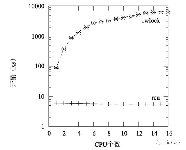 请注意,在单个CPU上读写锁比RCU慢一个数量级,在16个CPU上读写锁比RCU几乎要慢两个数量级。随着CPU数量的增加,RCU的扩展性优势越来越突出。可以这么说,RCU几乎就是水平扩展,这可以在上图中看出来。