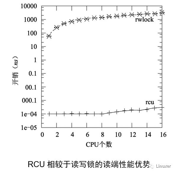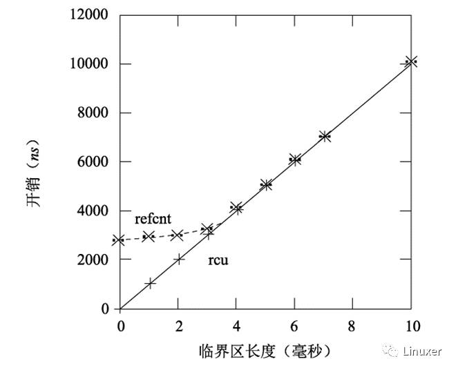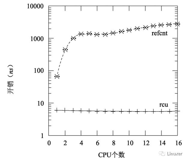 当然,RCU也可以与传统的引用计数结合。但是为什么不直接使用引用计数?部分原因是性能,如下图所示,图中显示了在16个3GHz CPU的Intel x86系统中采集的数据。