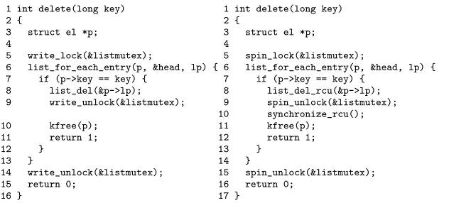 如果第9行判断为false,第13行获取更新端的自旋锁,然后第14行检查元素是否还是我们想要的。如果是,第15行退出RCU读端临界区,第16行从哈希表中删除找到的元素,第17行释放锁,第18行等待所有之前已经存在的RCU读端临界区退出,第19行释放刚被删除的元素,最后第20行返回成功。如果14行的判断发现元素不再是我们想要的,那么第22行释放锁,第23行退出RCU读端临界区,第24行返回错误以删除该关键字。