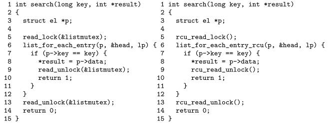 简单地说,读写锁和RCU提供了不同的保证。在读写锁中,任何在写者之后开始的读者都“保证”能看到新值。与之相反,在RCU中,在更新者完成后才开始的读者都“保证”能看见新值,在更新者开始后才完成的读者有可能看见新值,也有可能看见旧值,这取决于具体的时机。