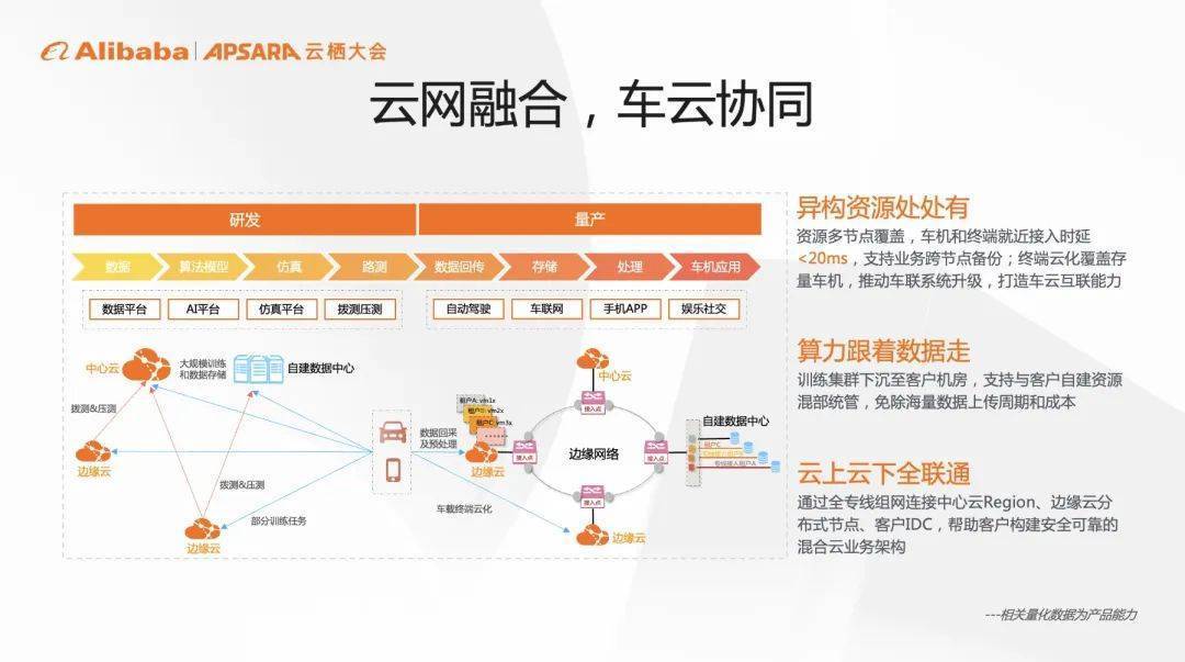 在云网融合场景,阿里云边缘云助力自动驾驶行业打造车云协同能力,通过异构资源多节点部署,实现车机和终端就近接入时延小于20ms。