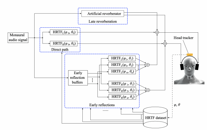 在渲染时,通过输入的角度信息,先从数据库中选出当前角度的HRTF对。然后再将输入数据分别和HRTF对进行卷积得到左右耳信号。为了得到更逼真效果,还可以添加一定量的房间混响如下图所示: